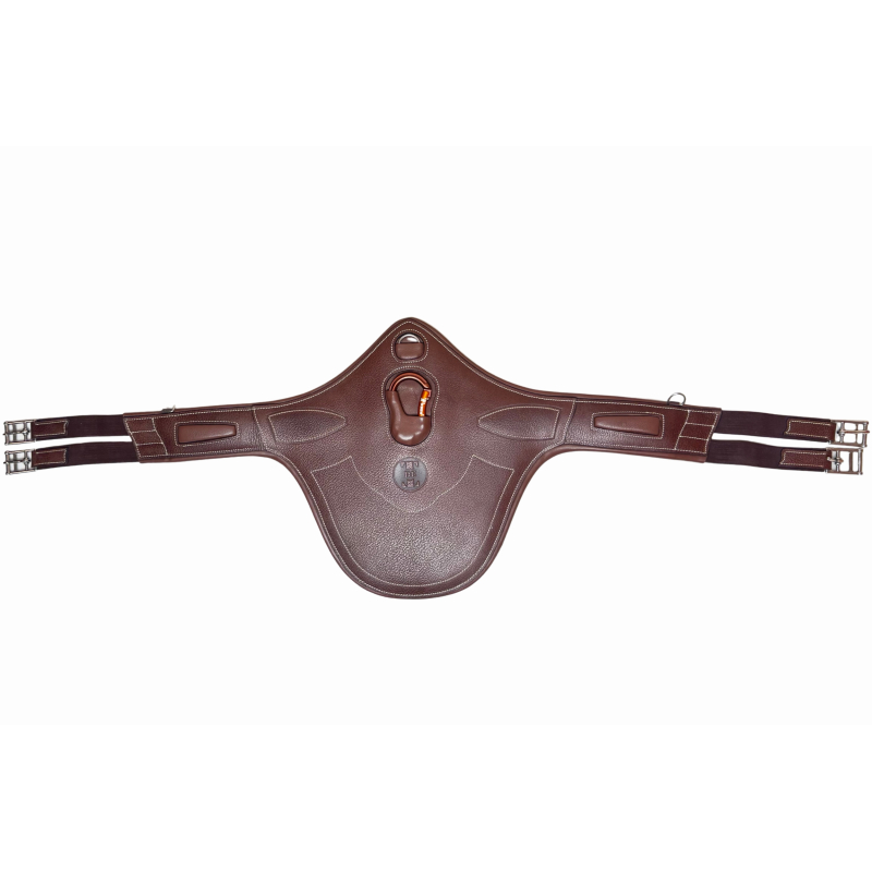 Les trois épaisseurs d'élastiques de la pointe de sangle assurent la bonne sécurité du cavalier lorsqu'il est à cheval. Les boucles inox à rouleaux et les sanglons élastiques facilitent grandement le sanglage, réduisant l'effort nécessaire et préservant les contre-sanglons de l'usure. Le système de fixation des enrênements, avec un D central et un mousqueton pro recouverts de cuir, simplifie les ajustements tout en offrant une esthétique soignée.