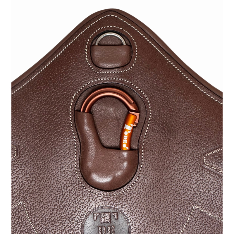 - D central et mousqueton pro exclusifs T.de.T, recouverts d'une protection en cuir pour la fixation des enrênements.