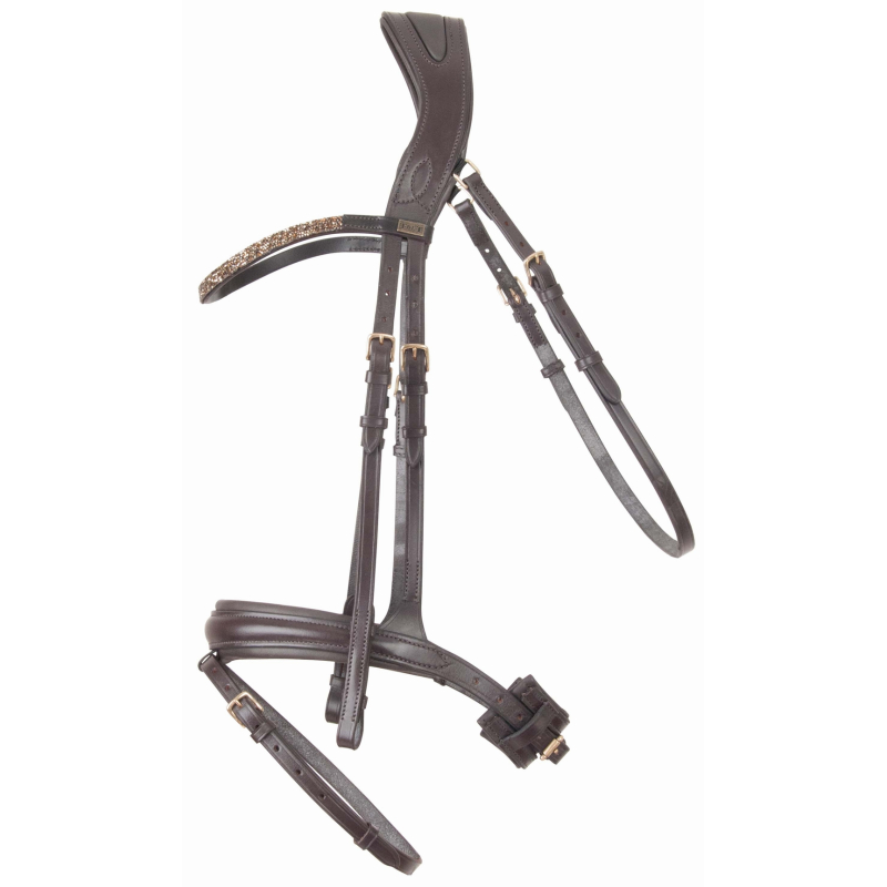Bridon têtière reculée et large afin de dégager les oreilles et répartir les pressions au niveau de la nuque.