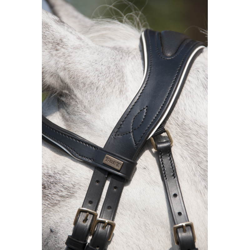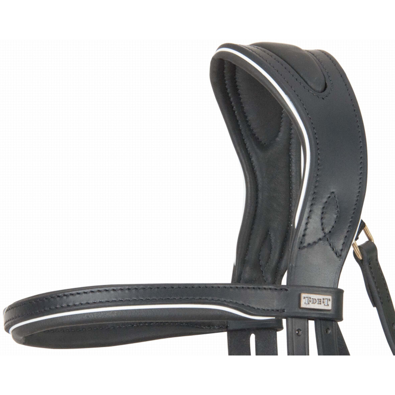 Bridon à la têtière reculée et large afin de dégager les oreilles et répartir les pressions au niveau de la nuque.