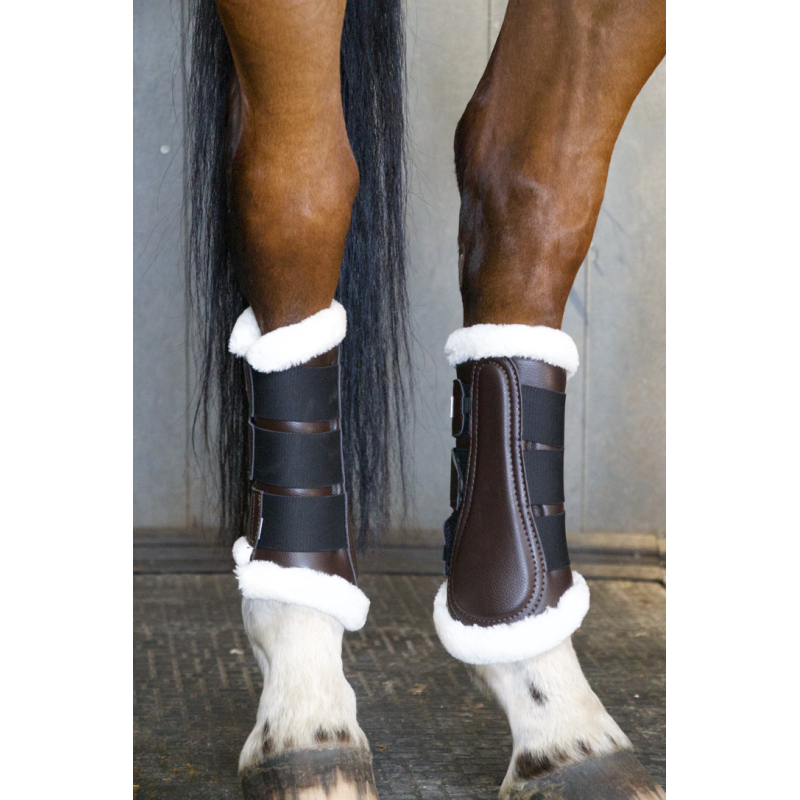 Dressage boots for hindlegs made of leather and synthetic sheepskin.