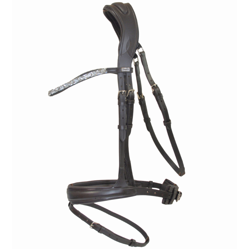 Bridle made of "superior" buffalo leather and delivered with rubber reins with large pins.