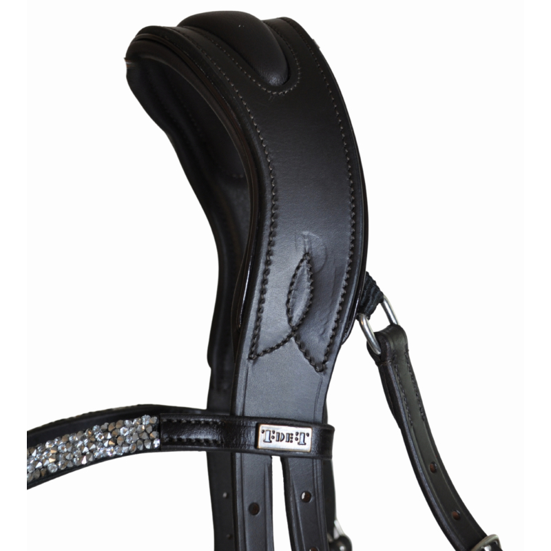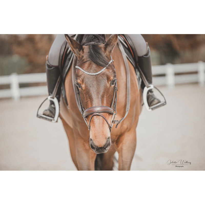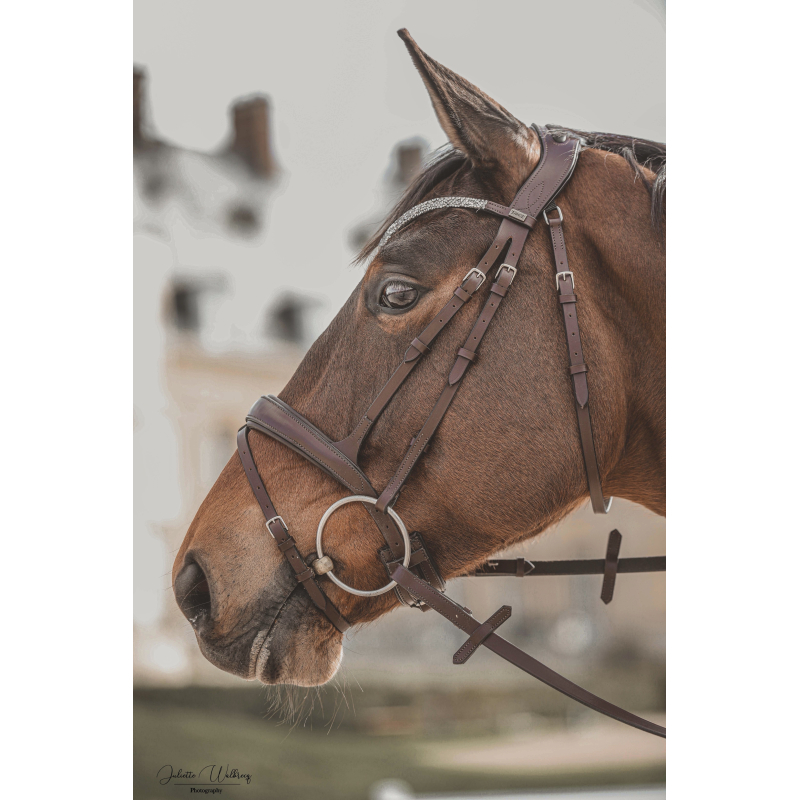 Snaffle bridle with wide, set back headstall to free the ears and distribute the pressure at the nape of the neck.
